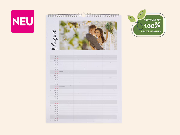 Unser Digitaldruckkalender Matt präsentiert Ihre Bilder in hoher Qualität und mit zeitloser Eleganz, dank seiner reflexionsarmen Oberfläche. Er ist unempfindlich gegen Fingerabdrücke und verfügt über eine beschreibbare Oberfläche, die Ihnen ausreichend Platz für Notizen bietet.