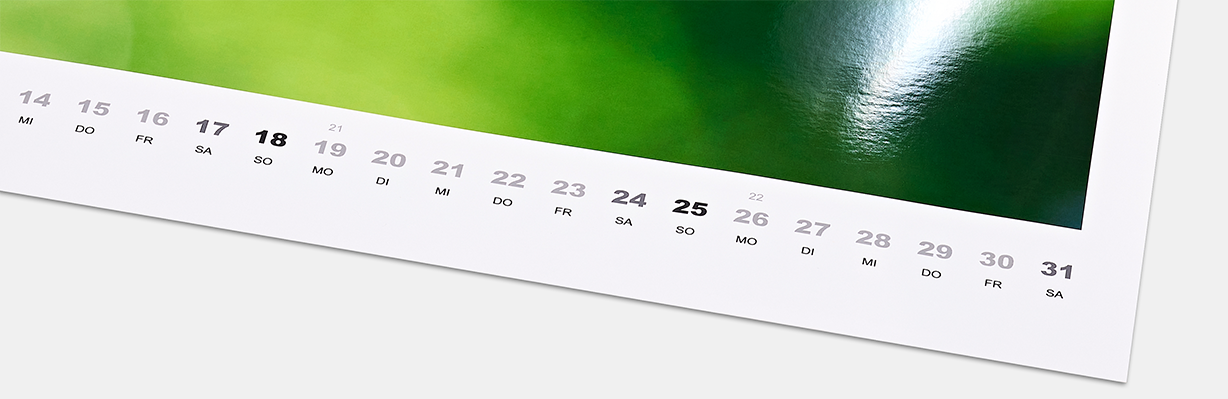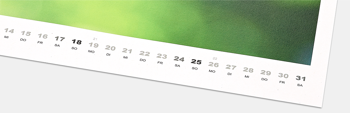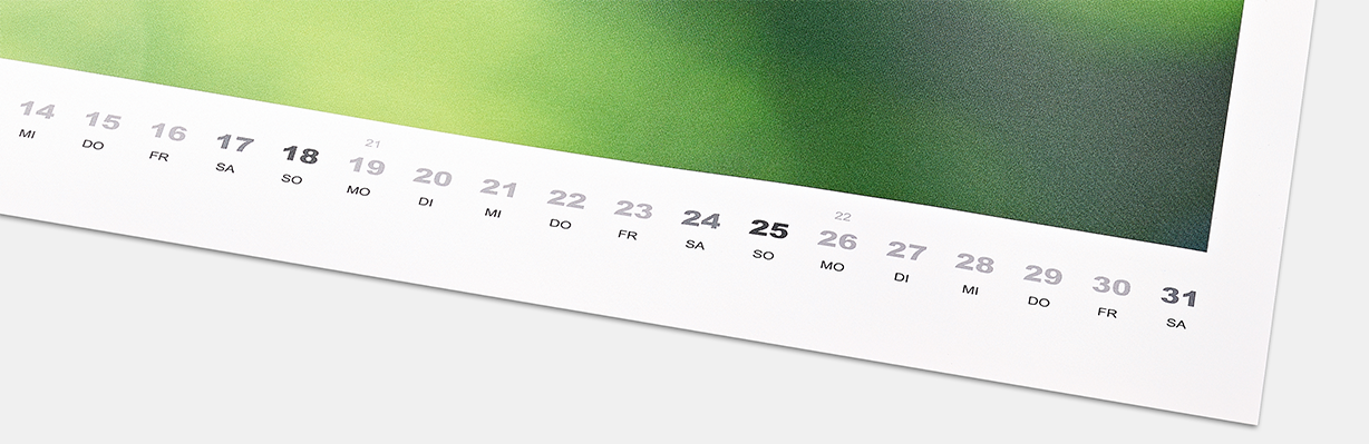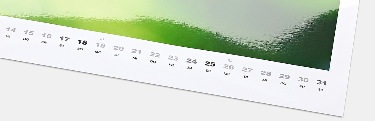 Ihre bevorzugten Fotos entfalten eine besondere Eleganz dank der seidigen Oberflächenstruktur. Lichtreflexionen werden auf ein Minimum reduziert, um ein optimales Betrachtungserlebnis zu gewährleisten. Präsentieren Sie Ihre Bilder auf seidenmattem Fotopapier höchster Premiumqualität in unserem Fotokalender.
